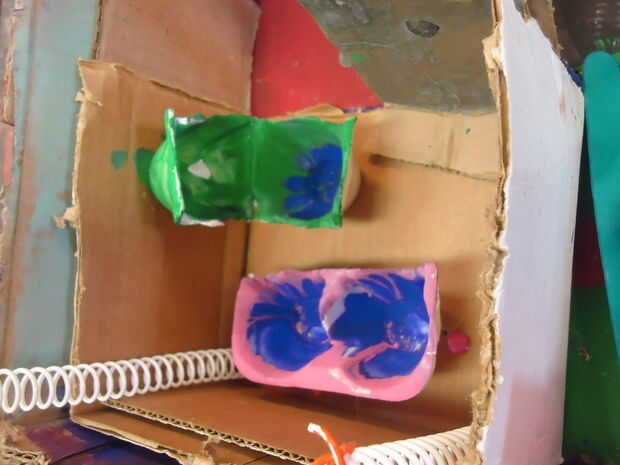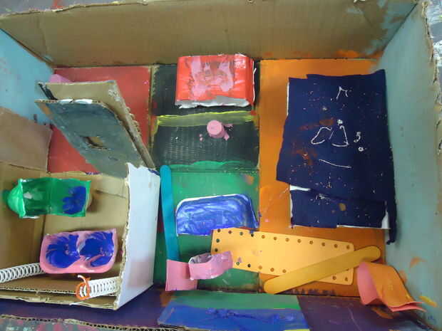 Hice mi casa de ensueño. Usé todos los materiales reciclados para construir y luego he utilizado pintura asi podía escoger los colores que quería para las paredes y muebles. Lo hice para mis muñecas vivir.