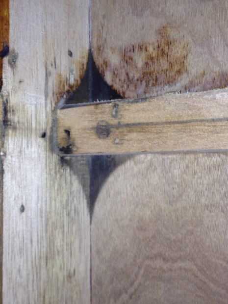 Los puntos triangulares poco graciosos en la tercera foto son ejemplos de lija madera vs la madera sucia. Estaba usando una lijadora orbital de mano que no pudo llegar a las esquinas. Este desorden fue realmente mucho Sojo que indican las fotos.