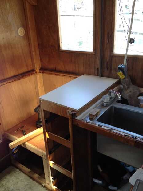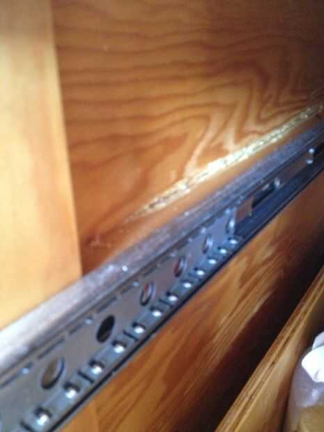 Este proyecto es una mezcla de trozos de madera de diferentes espesores, y pocos si cualquiera fuera a plana. Las diapositivas del cajón del rodamiento de bolitas son muy exigentes. Necesitaba una caja cuadrada rígida para los cajones. Una vez que forma la pared posterior y el piso, el nuevo panel de soporte fue aprovechado suavemente en su lugar con bloques de madera en la pared posterior hasta que fue perfectamente recta. Algunos de los bloques pequeños necesitan para mover varias veces, desde atornillar abajo algunas veces hacía deriva hacia adelante y hacia atrás. Refiriéndose a la foto de arriba, las tiras de apoyo elevado donde se unen las correderas están allí tanto por su acción de refuerzo en cuanto a la alineación con el frontal de la caja del cajón. Lo que finalmente se convirtió en el mostrador también era corte y perforado en este momento para mantener el borde superior del soporte en su lugar. Estoy mostrando la foto con la encimera en este paso ya que representaron para él en este momento aunque la foto real era desde un punto más adelante.