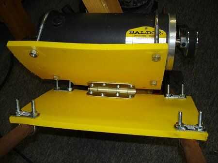 La tercera foto muestra la bisagra que une las dos piezas de plástico y les permite moverse entre sí. Esto me permitirá ajustar la tensión de la correa de conducción del generador. Usé una bisagra de puerta de latón grande. La belleza de esto es que solo tengo que sacar el pasador de la bisagra para separar las dos piezas. La próxima vez que probablemente utilizaría dos bisagras para dar añadido apoyo y fuerza.