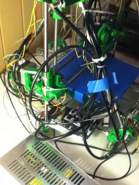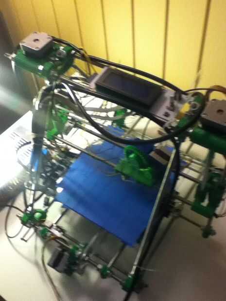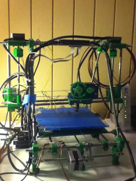 Este dispositivo es una impresora 3d de Mendel Prusa. Es RepRap, lo que significa que es de código abierto. Empecé el trabajo en agosto en 2012 y yo apenas lo estoy terminando ahora, el único paso restante es hacer la calibración fina. El marco está hecho de varillas metálicas roscadas, y el verde están hechos de plástico y han sido fabricados en otra impresora 3d. Utiliza un modelo 3d, que luego se convierte en un código. Ese código se envía a un Arduino Mega, que luego convierte en movimiento de los cinco motores paso a paso. Se mueve en tres dimensiones, deslizándose sobre las varillas roscadas. El extremo caliente obtiene hasta 200 grados Celsius, luego plástico es empujado a través de él, fundido y está formado en la forma. Como mover los motores, extrusiones de plástico capa por capa, haciendo poco a poco el modelo que diseña en la computadora.