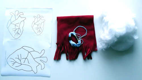 Coge algunos desecho corazón color tela (utilicé los restos de una bufanda del paño grueso y suave), una aguja de bordado y de hilo en vena y azul + un poco de relleno o