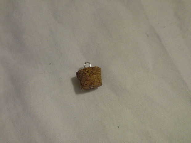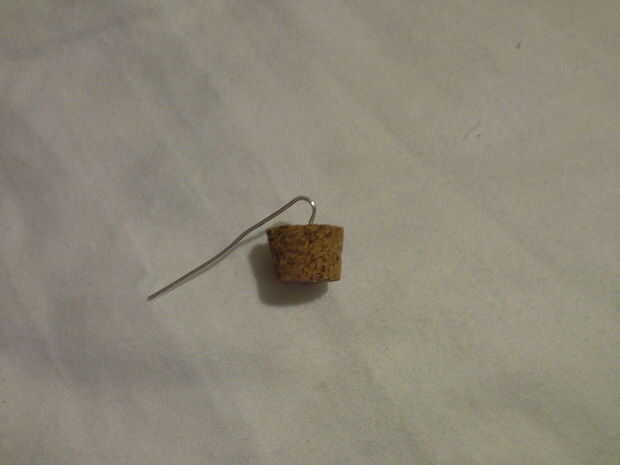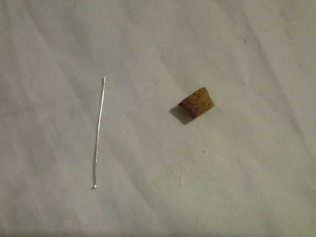 Es de lo primero que vamos a trabajar con el perno de la cabeza y el tapón de corcho. En primer lugar, retire el tapón de la botella. A continuación, empuje la aguja a través del centro del corcho, para hacer un pequeño agujero para el perno de cabeza pase a través. Levante el perno de cabeza por el centro del corcho como se muestra en la fotografía. Una vez que la "cabeza" del perno cabeza firmemente contra la parte inferior del corcho, haga un bucle desde el cable que ahora se está pegando para arriba por la parte superior del corcho. Recorte cualquier exceso de alambre con el alicate.