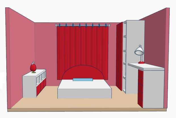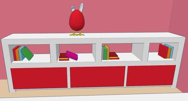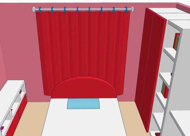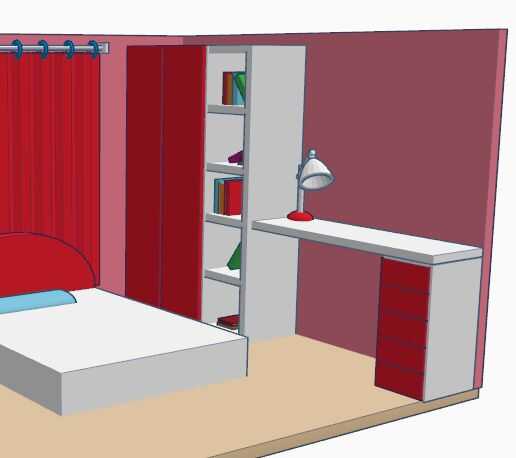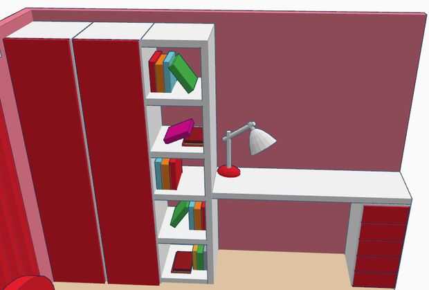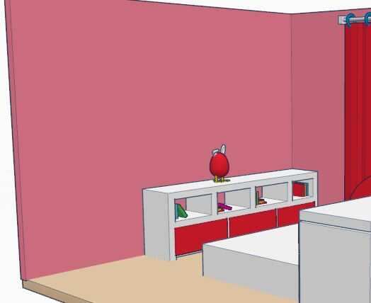 En la pared izquierda, hay un gabinete corto. Ella puede poner muñecas y libros en él. Serán a una oficina y closet en la pared de la derecha.