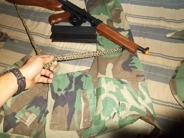 aquí está una lista de materiales que necesitará para montar el cabestrillo:Rifle de aire suave CROSMAN R39llavero con 1,125 pulgadas radiocorrea de hombro de ordenador portátil con ganchosSi los ganchos de la correa están demasiado amplias, necesita