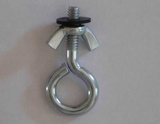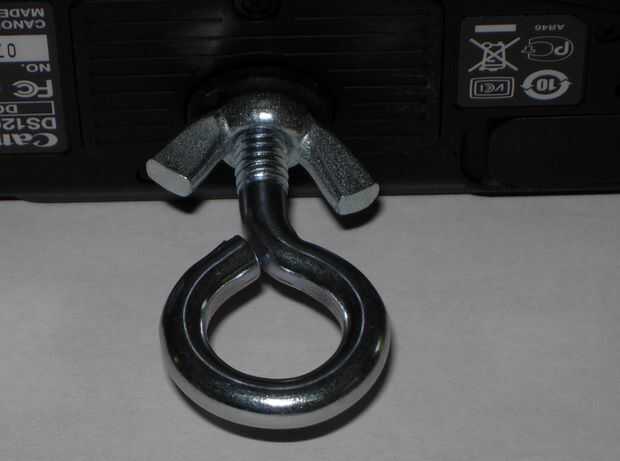 He visto algunas personas Coloque la correa en el anillo en una placa de trípode. ¡ HAGA ESTO! Ese anillo está diseñado solamente para ayudar a tornillo en la placa y no está diseñado para soportar peso. Doblan con facilidad, y no quieres que esto suceda cuando está apoyando a la cámara. He comprado un ¼ "x 2" perno de ojo, la arandela de neopreno y tuerca de mariposa para cerca de $2 en mi almacén de hardware local. Mediante el uso de una tuerca de mariposa, puede atornillar el tornillo en la mayoría de la manera y luego apriete la tuerca de mariposa. Esto evita que le de apretar el perno de ojo y rompiendo su trípode. La lavadora protege la parte inferior de la cámara.
