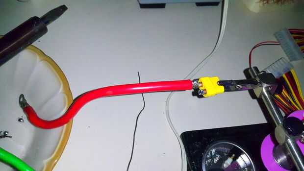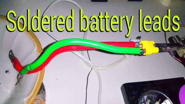 Cada XT60 está polarizada. El lado plano es para positivos. Usé mi soldador de 100 Watts para unir los cables de calibre pesados a los conectores.