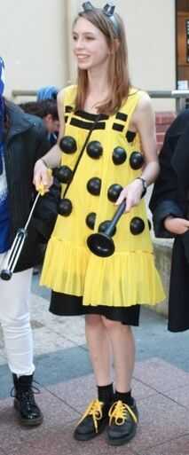 yo estaba muy contento con la última cosa... tomó un tiempo y cometí muchos errores pero fue muy divertido. Me lo puse con zapatos escolar negro con cordones de amarillo en ellos (sólo tengo martens doc amarillo por lo que no puedo esperar a usarlo otra vez con ellos) y cuando se puso más frío me pongo mi chaqueta de cuero negro. Lo que encontré difícil era sentarse (porque estaba viendo el 50 º aniversario en el cine), es bastante incómodo, así que sólo he comprado un vestido negro llano para ir por debajo de ella por lo que sólo puedo látigo los Dalek del vestido si es necesario sentarse;). Espero que esto era útil si alguna vez quieres hacer un dalek vestido :)
