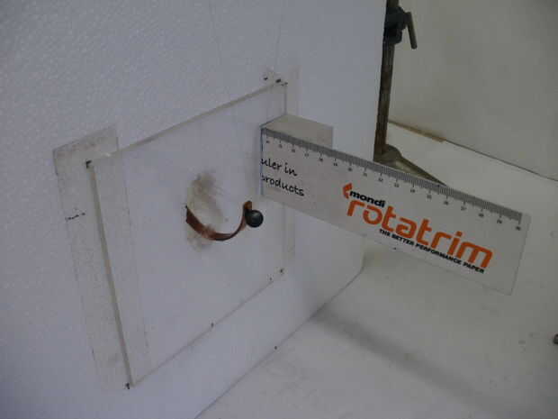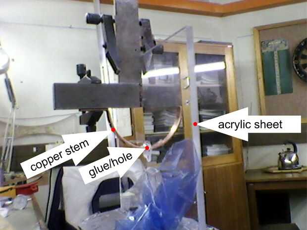 Aquí puede ver la bola colgante contra el vástago de cobre. El vástago pasa a través de un agujero en el centro de la hoja y se pega a él. Se utilizó un brazalete para la espiga de cobre. Uno de los extremos del tallo fue doblado horizontal (tengo la intención de hacer una copa de metal en algunos experimentos). La hoja se sujeta verticalmente en un vicio mientras fijaba la resina sosteniendo el tallo a la hoja. Una escuadra y dos pinzas más mantienen en el lugar durante este tiempo. El hecho de que la madre cobre es gruesa y no demasiado grande también juega en el electroscopio siendo muy efectivo. Un pedazo de regla plástica también se pega a un bloque de apoyo a lo largo del borde de la hoja. La regla se utiliza para medir las deflexiones de la bola cuando el electroscopio esté en uso. Pretendo mostrar cómo el electroscopio se utiliza en otro instructivo.