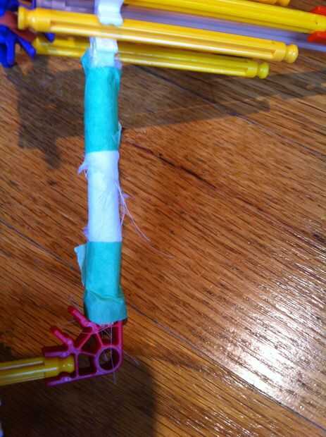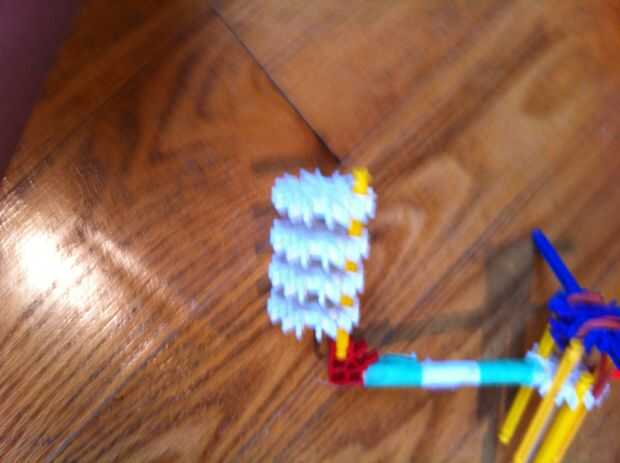 Aquí están las piezas que se necesita para la pistola:Dos barras de Tinker Toy larga azulesTres bandas de cauchoUna Nerf dartUna pinza para la ropaLa segunda imagen es el producto final.Paso 1: Paso 1: hacer barril Tomar dos bandas de goma y conecte