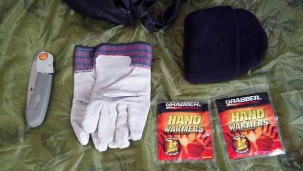 En el bolsillo del lado derecho tengo un par de rotos en cuero guantes de trabajo. También tengo una gorra de lana negra para mantener caliente mi melón. Esto sería usar inmediatamente en caso de un desastre. También tengo algunos calentadores de la mano que puedo arrojar mis bolsillos si hace frío. También hay una pequeña sierra plegable. Mucho menos atención que un machete.