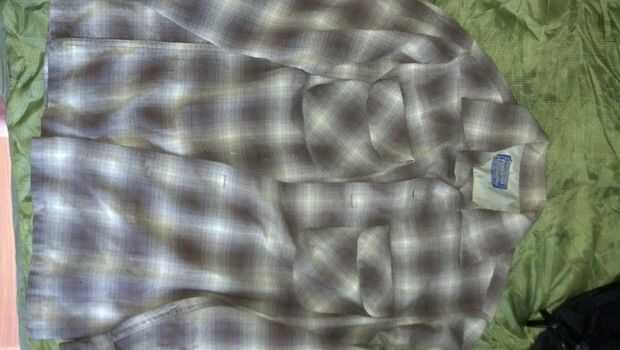 En primer lugar, tengo un botón de lana 100% camisa con este asombroso borrosa verificar patrón a él. Compré esto en una tienda vintage, y fue hecho originalmente en la década de 1950. Aunque tiene algunos pequeños agujeros (y tuve que sustituir un botón de la banda), es en forma increíble. Los agujeros están a menos que el tamaño de una moneda de diez centavos y no en las secciones de tensión, como los codos. Esta cosa es una impresionante adición a convertirse en un "hombre gris". El patrón de verificación con su silencio, tonos tierra no llamar la atención como una camisa rojo, o púrpura, amarillo o azul, o cualquier tipo de camiseta con un logotipo, el patrón u otras chorradas superfluas en él. Además de que es muy borrosa (sólo ver la imagen tamaño completa durante 30 segundos), por lo que desde la distancia, funciona como camuflaje contra los ojos. No hay marcas. El hecho de que es 100% lana es un bono, ya que te mantendrá caliente incluso cuando está mojado. Además de que es luz. Sólo deseo que tenía bolsillos de mano (tal vez agregaré algunos). Pongo esto inmediato en caso de emergencia, para abrir más espacio en mi paquete.