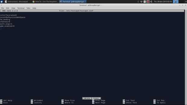 Esto crea un hotspot Wi-Fi abierto, llamado MyPhysicalWebSpace, utilizando el canal 6. Editar estos atributos en consecuencia, si lo desea. Guardamos el archivo presionando Ctrl + o y luego salir pulsando Ctrl + x .