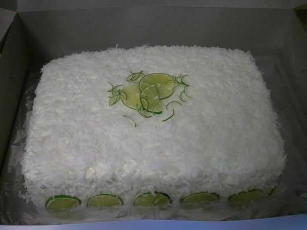 Torta de crema de limón con limón batida glaseado, coco rallado y limón decoración/decoraciones