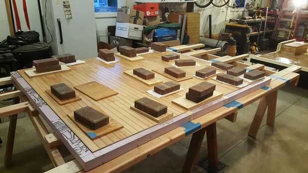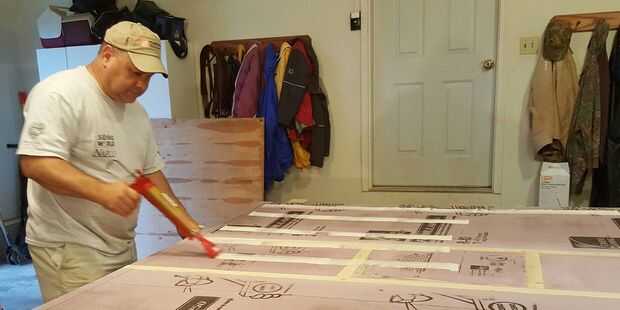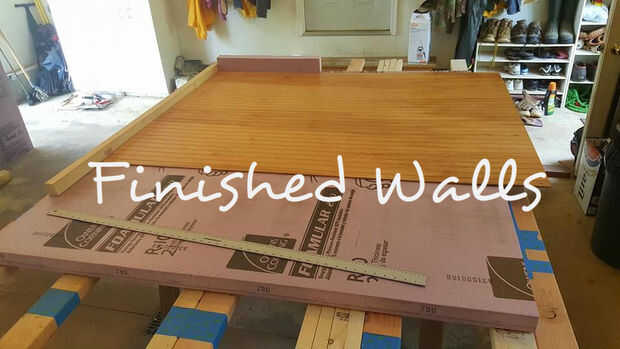 Para pegar los paneles de la espuma de las paredes estoy usando líquido clavos adhesivo de paneles con un aplicador de masilla pistola y pegamento. El adhesivo es un rápido sistema así que prepárate a trabajar rápido. Una vez que fue pegado en su lugar pongo algo de peso que mantenga presionada mientras el adhesivo creado. Nota: dejé offset de 2 1/8 de pulgada a cada lado de las paredes de lado a pero en y offset de 1 5/8 de pulgada en la parte inferior para eliminar el 2 x 2.
