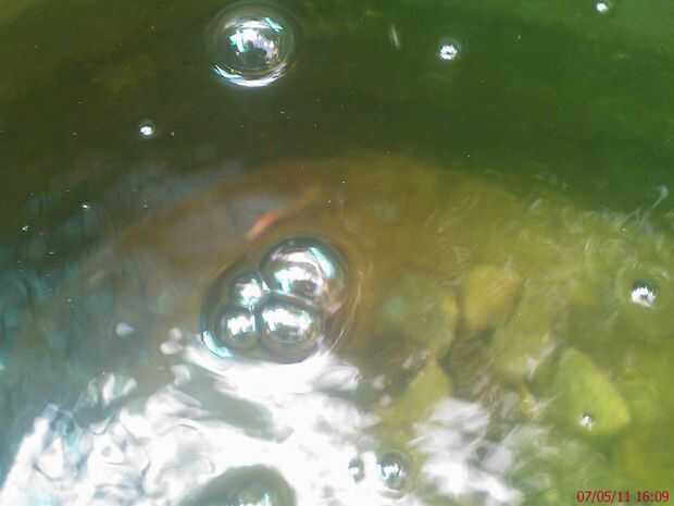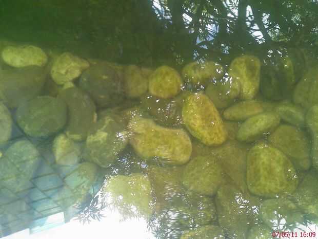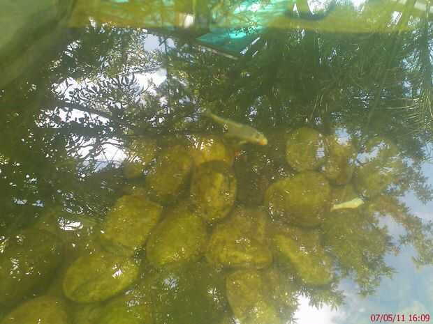 En ele estanque viven 2 peces koi, y unos 30 peces pequeños que no tengo idea de especie sean, y un Pleco para limpiar un poco el alga...