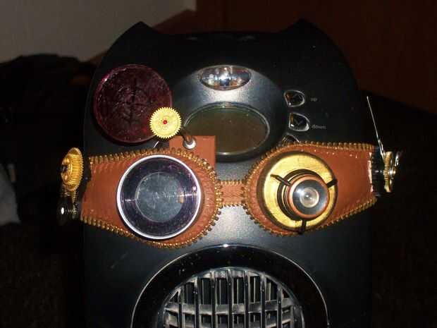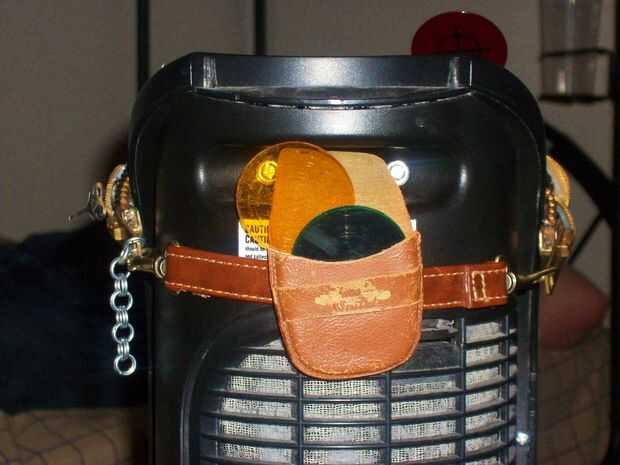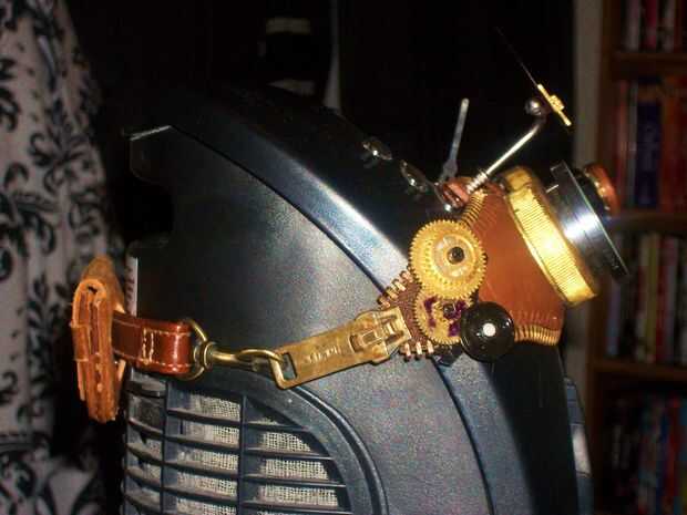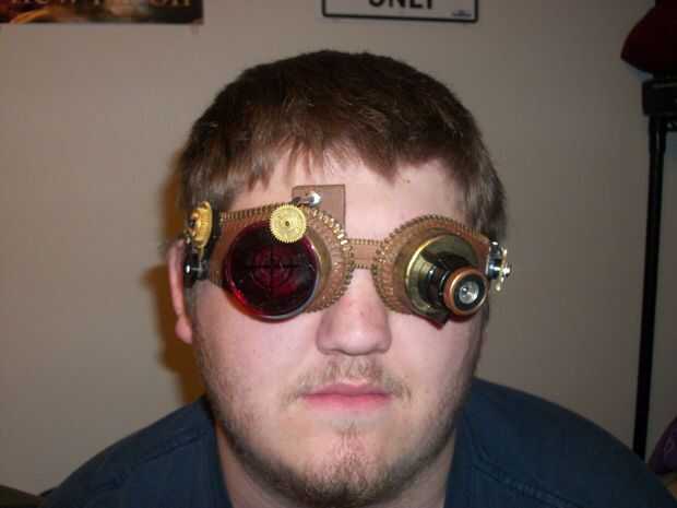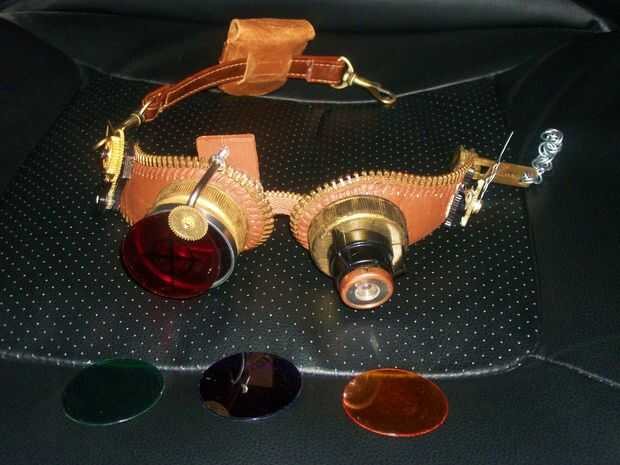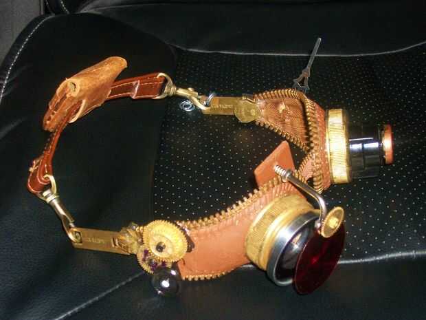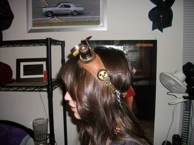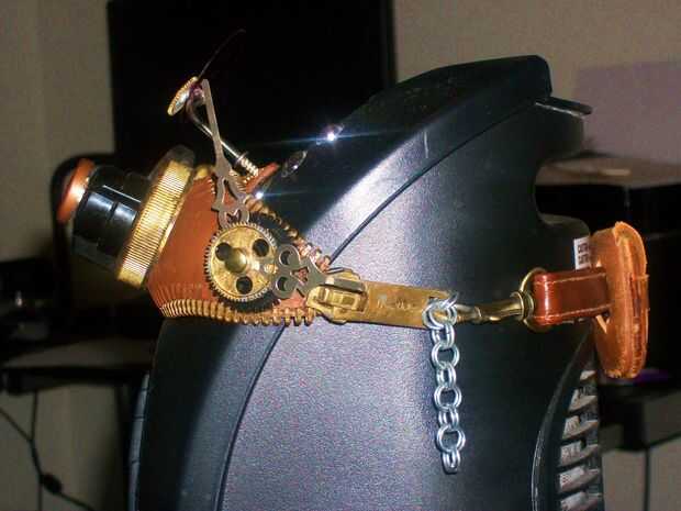Añadí extensiones cremallera grande alrededor de la piel de béisbol y utiliza los tirones de la cremallera grande para conectar a correa de un bolso viejo. El ojo más grande es un viejo filtro de cámara y el ocular más pequeño es una mirilla de una puerta y una pieza de hardware. Por un lado hay manos de reloj de latón y el otro tiene 3 engranajes plásticos de trabajo que he pintado. Todos los engranajes de estas gafas son de plástico y son de varios dispositivos electrónicos como discos duros, reproductores de CD, reproductores de DVD y otras cosas que llevó aparte para otro proyecto en la misma clase.