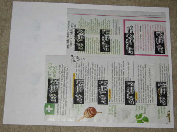Yo había mejor suerte con las revistas brillante como el día de la mujer. Mi impresora no es un plano y el papel brillante era demasiado débil para correr a través de él por sí mismo, así que tomó una hoja de la revista y pegadas a una hoja normal de papel. Es mejor utilizar una página que es sobre todo blanco, por lo que es más fácil ver donde su imagen está en el brillante. Vea la foto. Aquí una de las imágenes brillantes ya retirada y corte para arriba, pero yo había grabado la parte inferior y la parte superior antes de la impresión.