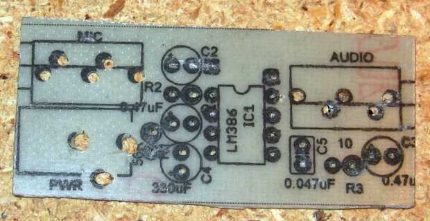 Así que todos los pequeños círculos de cobre hay que taladrar para los componentes. Coloque el lado de cobre de la PCB hacia arriba sobre un trozo de madera o fibra de madera.