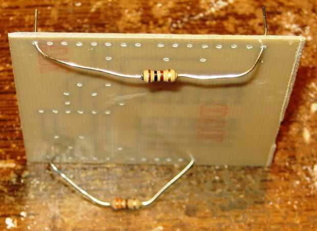Meter algunos plomos del resistor en los correspondientes cuatro agujeros de la PCB. Vea la foto.