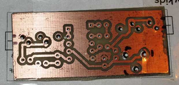 Utilice el mismo procedimiento, retire la cinta, remoje en agua y frote con cepillo de dientes para sacar brillo. Usted debe tener una seda defendido PCB. Vea la foto.