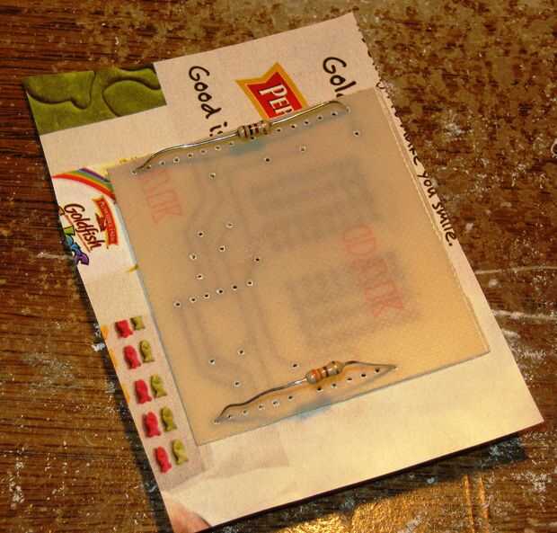 Deslice la seda capa brillante sobre la cabeza de la resistencia y coloque la brillante a ras con la placa. Vea la foto. Esto alinea la capa de seda con las huellas y las almohadillas.