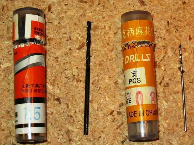 Para brocas, compré algunos pedacitos de 0,8 mm en ebay y algunos 1, 5 mm. Para agujeros más, uso el 0,8 mm. Ver fotos.