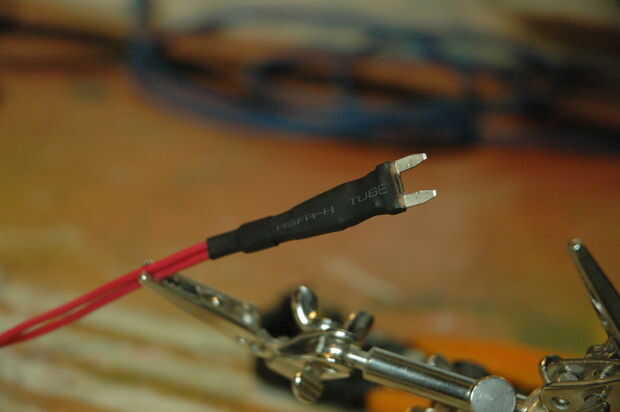 Con los cables es fácil doblar el fusible lo suficiente a desalinear los terminales. Fuerte la cosa un poco, llenar el espacio entre los cables con pegamento caliente antes de colocar la pieza final del tubo del encogimiento.