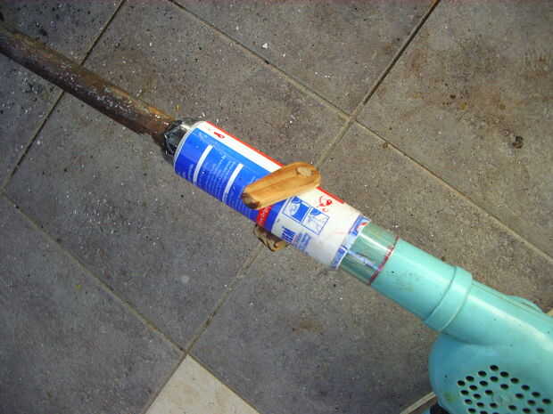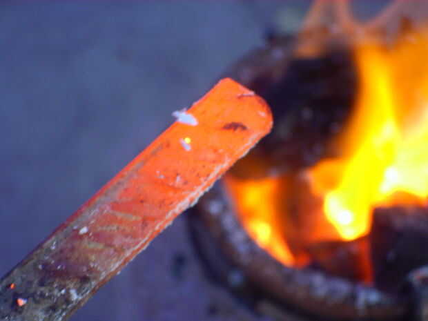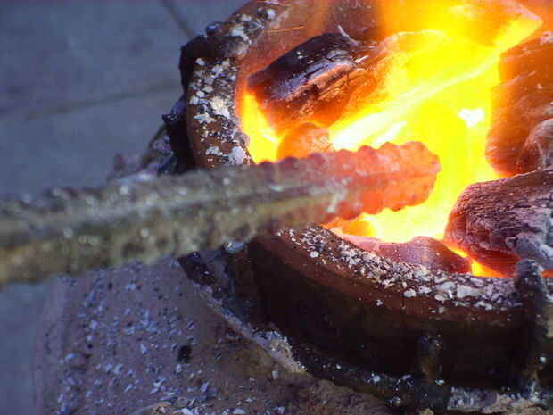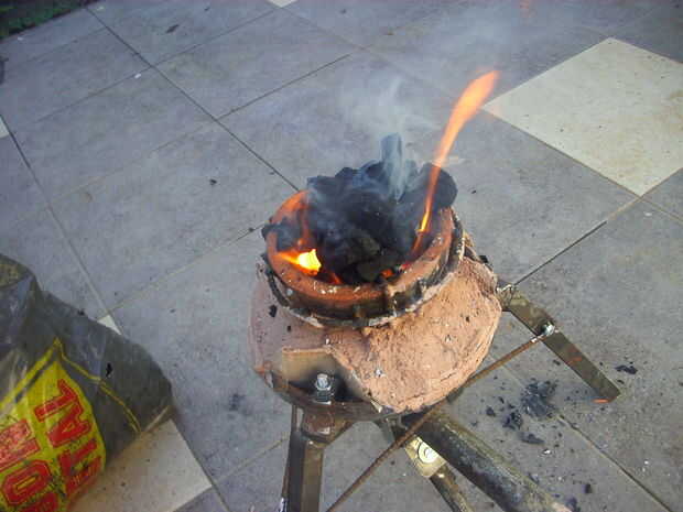 El gran día llegó, y todo fue increíble como esperaba. Se presentaron sin explosiones, sin quemaduras, nada malo. El fuego encendido rápidamente, ayudado por un suave flujo de aire del ventilador con control de aceleración completamente cerrada. Ponga una plancha de construcción de 10 mm y en menos de un minuto fue la luz roja. Incluso podría haber derretido la punta, pero no quería que fuerza el horno porque no pudo resistir el cemento refractario, ser muy nuevo, así que después de comprobar que todo estaba bien, apagar el fuego. Hubo un problema, que debería haber previsto en tiempo de diseño: las brasas caen al suelo al mover la pieza, por falta de una mesa alrededor de la taza. Que se fija fácilmente.