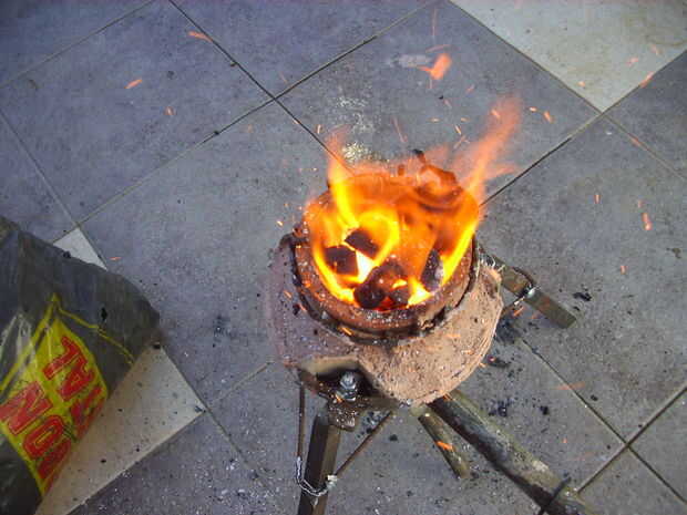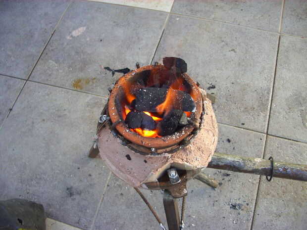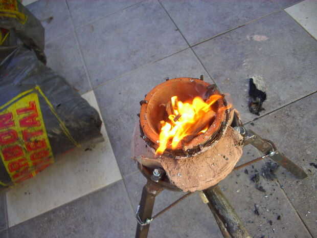 Hubo un problema, debí haber previsto al diseñar: los carbones se caen al piso al mover la pieza, por falta de una mesa alrededor de la cazoleta. Eso se arregla fácilmente.