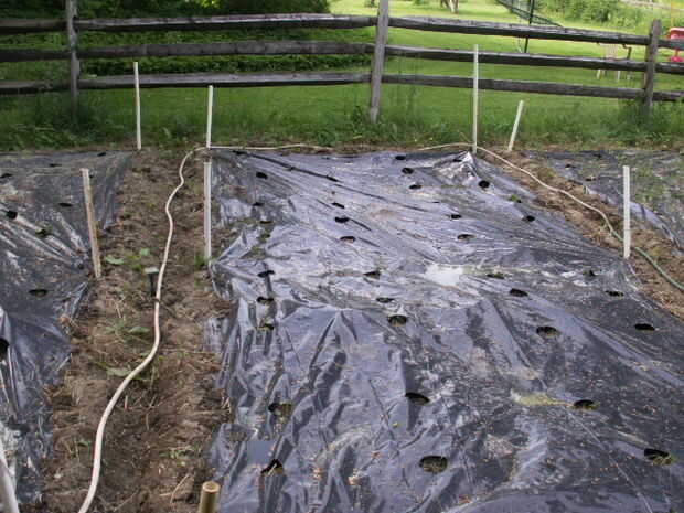 y es mantenido abajo por algunos pvc viejo que tenía puesta, después de rototiller extienda su lona y proceder al corte tengo un cortador de círculo lo hace mucho más fácil pero se pueden utilizar plazas