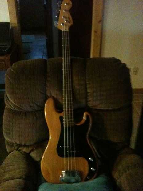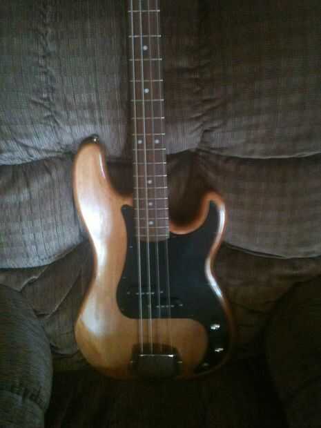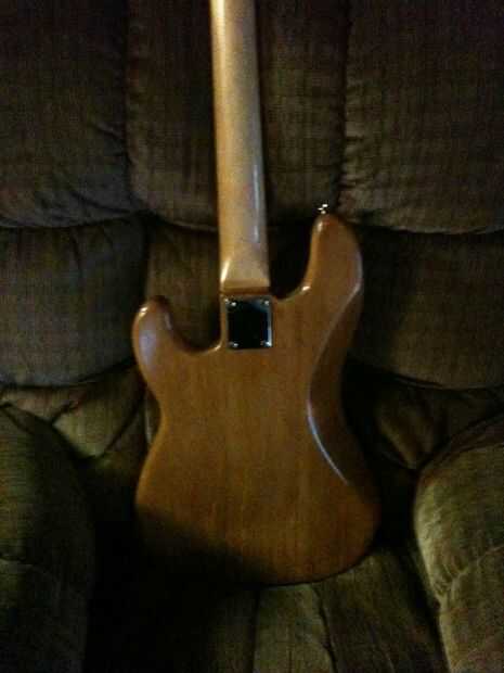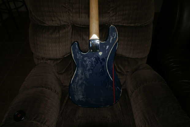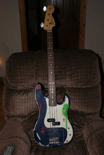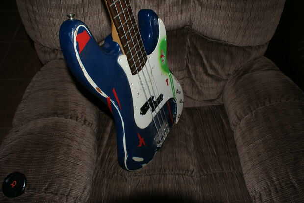 un tiempo atrás, me compró un bajo Squier de Fender en una tienda de empeño por $60, había tenido una vida áspera. Cuando compré el bajo tenía alguna pintura en aerosol en puntos de él, y habían sido rociado en brillo. Era originalmente azul y creo que alguien lija los bordes un poco al blanco para darle un aspecto personalizado. Tipode le gustaba la forma en veía en realidad pero quería lo de la mancha y hacerla mía. Así que llevó a la casa y había despojado de la pintura y había lo había manchado. Pinté el golpeador, comprada algunas perillas y una cubierta de puente y algunas cuerdas nuevas. Fue muy divertido, mi primera de este tipo de proyectos. Tuve una explosión haciendo.
