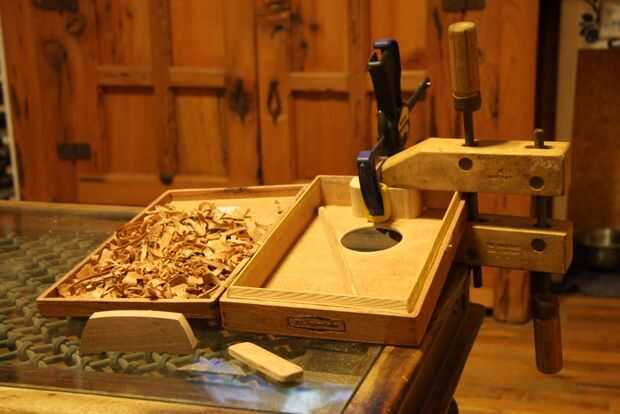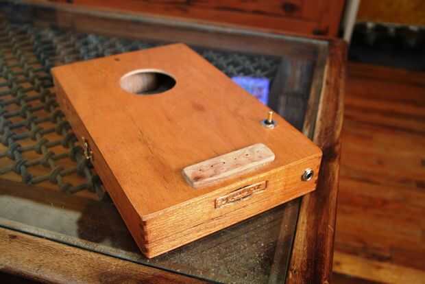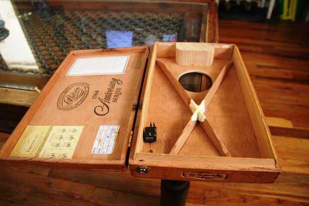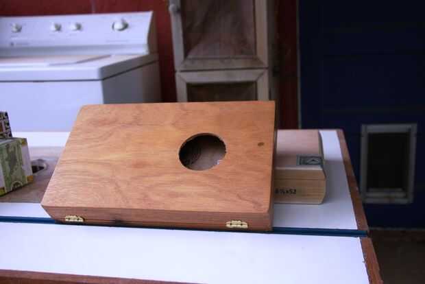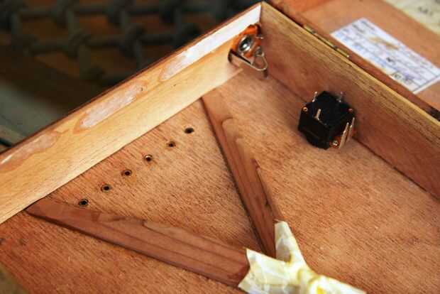 así que hice mi primera guitarra de la caja de cigarro este verano. Es un bajo de la cadena cuatro. Sin embargo, es difícil encontrar buenos ejemplos de un maletín de pantalla para él. Diseñé de pino de 1 por 2 con paneles de madera contrachapada.
