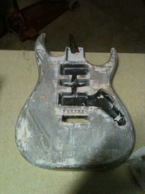 un tiempo atrás, me compró un bajo Squier de Fender en una tienda de empeño por $60, había tenido una vida áspera. Cuando compré el bajo tenía alguna pintura en aerosol en puntos de él, y habían sido rociado en brillo. Era originalmente azul y creo q