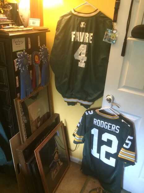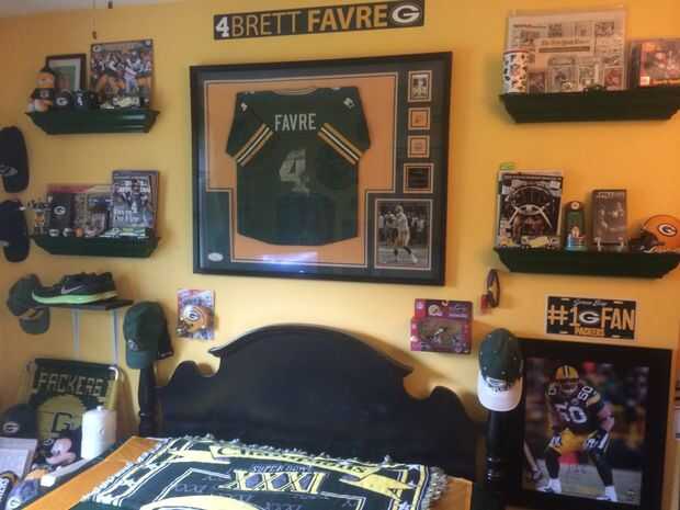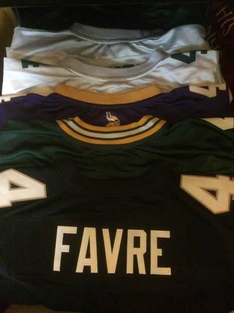 Como cualquier fan verdadero tengo un montón de camisetas. Fácilmente tengo 10 camisetas. ¿Cuál es mi favorito? Bueno mi favorito es el que nunca utilizo. Es el que se enmarca. Uno se pregunta, ¿por qué es una camiseta en que condición colocada en un marco tan agradable? Bueno realmente tiene mucho significado para mí. Para uno era mi primer jersey que he tenido. Es una camiseta de la marca de arranque de Brett Favre. Yo y mi encontró en una venta de yarda cuando era muy joven. Primero a través de 5 º grado utilizan ese jersey durante mis prácticas de fútbol. Es por eso que es tan usado. Cuando estaba en 6to grado pensé que perdí un día porque no pude encontre. Un par de meses más tarde para la Navidad mi papá había enmarcado lo secreto para mí. Es por eso que significa mucho para mí. Además soy un gran fan de Brett Favre.