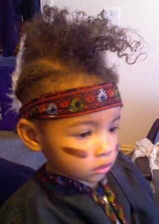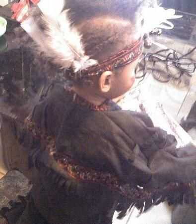 hice este traje hace 3 años mi hijo del asilo. Pongo a menudo su pelo en 3 cornbraids en ese entonces y cuando descubrí qué lindo miró con un mohawk, sabía lo que él fue goin a ser. Por suerte mi esposo estaba a punto de un viejo par de pantalones de ultrasuede la tirada. Me salvaron y reutilizarlos. Los pantalones hacen un traje maravilloso para mi hijo y recibí muchos elogios cuando llevé a mis hijos ese día. Esta foto fue tomada en la escalinata frontal. Estaba tratando de conseguir su atención y mi otro hijo dijo algo y lo que su mano es hasta contestaba. Las otras dos fotos son diferentes ángulos de su traje. Pensé que era perfecto y espero que amo demasiado...