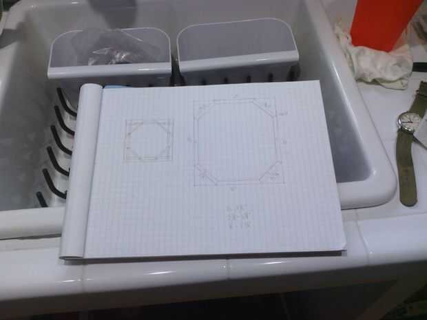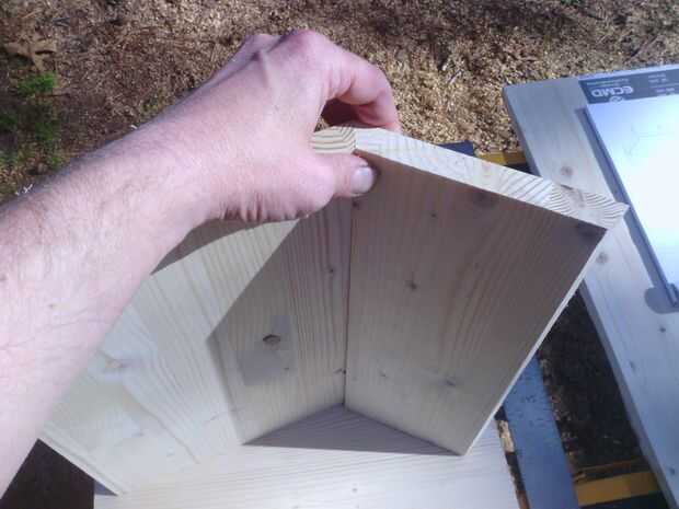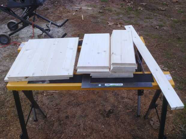Una vez que se cortaron todas las longitudes tuve que extraer las piezas en ángulos de 22,5 grados. Establece el ángulo de la hoja en 22.5 continuación, ajustar el tope-guía para cortar al cortar el primer ángulo. Para estos ángulos es difícil de medir contra la hoja porque, regla incorporada de la sierra no es muy precisa. Por lo tanto, pasar del diente de la hoja a la mesa y la medida de que se valla para el diente de corte interior. El primer corte es 15 3/8". Corrí todas las piezas a través de este corte para llegar al primer ángulo a un lado.
