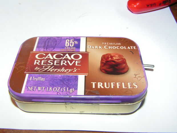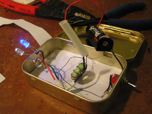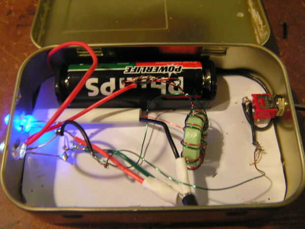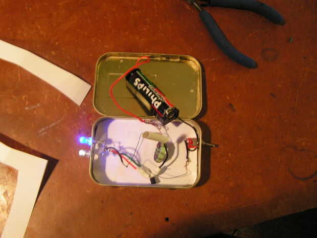 Hice usando 1ups instructable. Sólo añadir un interruptor y poner el proyecto en una vieja lata de Chocolate (lata Altoids).