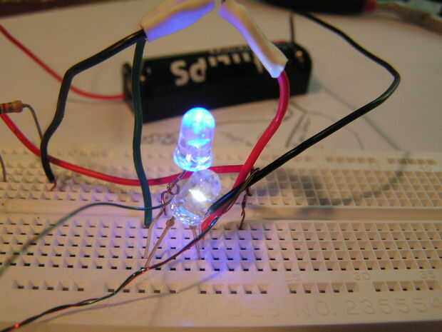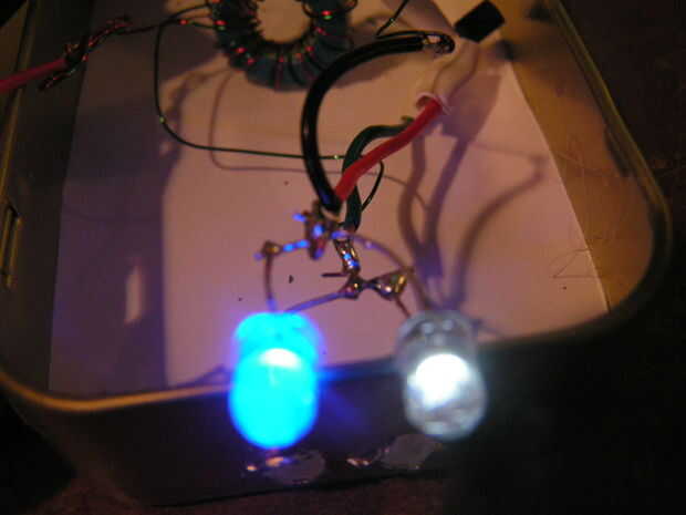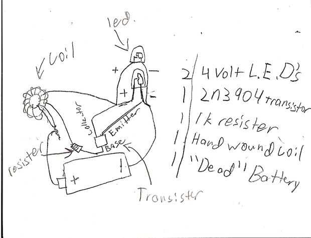 Este circuito trabaja por volver actuales y adelante 40hrtz (40.000 tiempo por segundo) la bobina acumula una carga de la > batería de 1,5 voltios, una vez que construirlo a 4-8 voltios pasa el poder a los Leds, iluminan la corriente está conectada a la bobina y el ciclo se repite más rápido de lo el ojo puede ver.