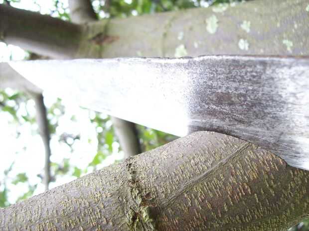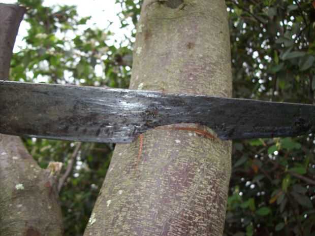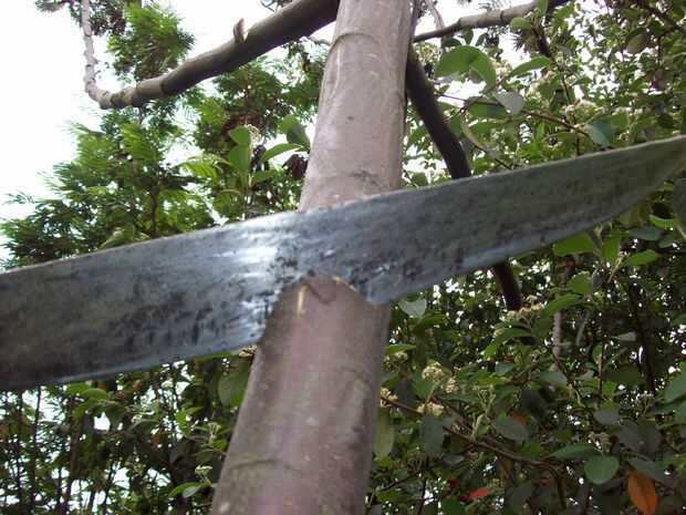 Me usar un machete Bill enganchado en el jardín de casa para diversas actividades como poda de árboles, cortar ramas no deseadas, descascarar coco, partida de madera y todo. Lamentablemente tiene roto el mango de madera del machete y se convirtió en