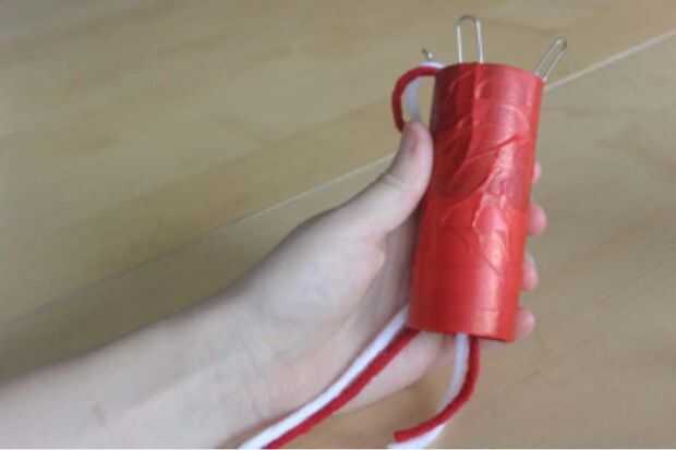 Maak een lusje en de draden haak en este sobre een van de clips. Lus daarna om de andere clips draad. Zorg dat de draad aan de binnenkant van je punnikmachientje blijft.