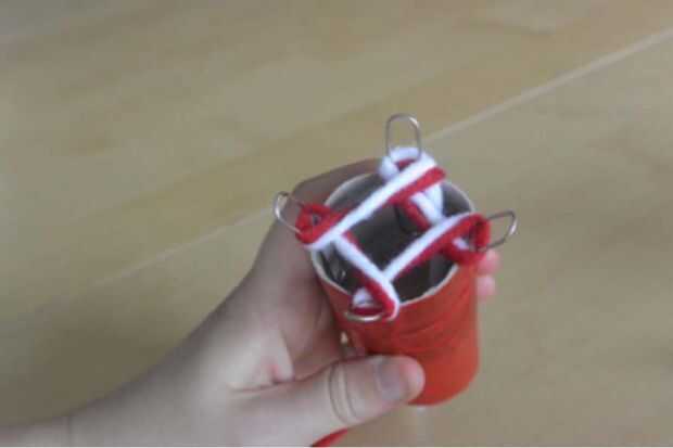 Maak twee rondjes met beide draden om de 4 paperclipjes om het punnikje vasta te pieza. Maak het patroon zoals op de foto.