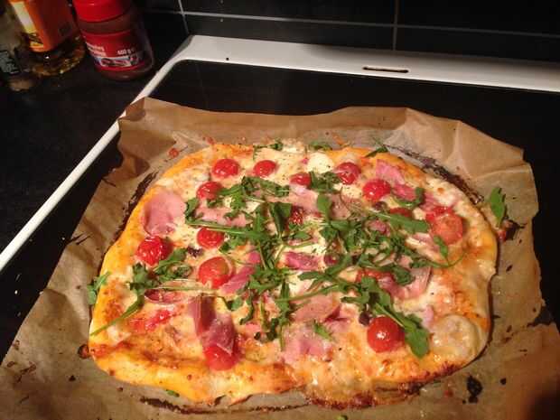 Una sencilla receta para masa delgada Pizza italiana rematado con salsa de tomate, queso Mozzarella y albahaca - desde cero!Receta de Daniella y abuela Emma de VideoCulinary.comPaso 1: Masa de PizzaLa masa de pizza: tamizar 500 gramos (18 onzas) de h