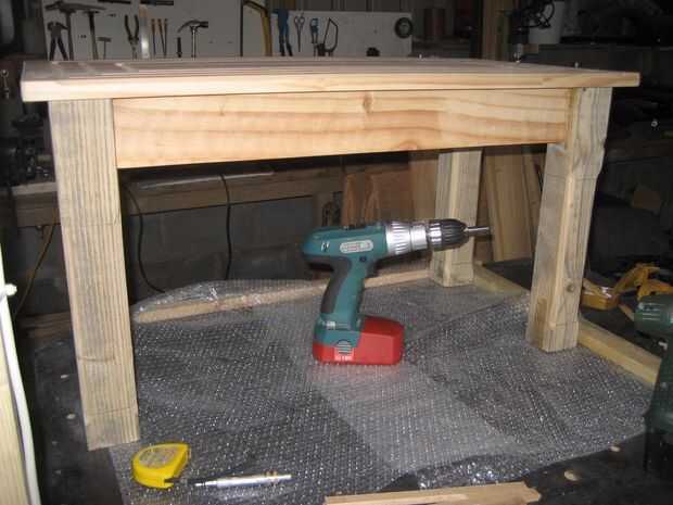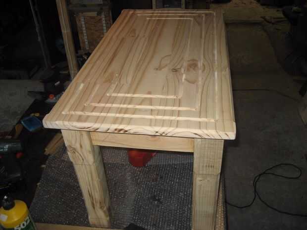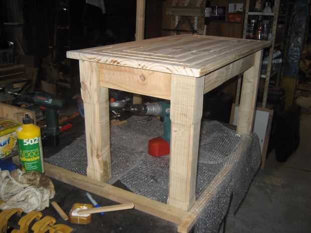 Entonces reuní a la mesa colocando las patas en las esquinas y atornillar en su lugar a las abrazaderas de las esquinas utilizando un cuadrado de material para techos que recta y verdadera.