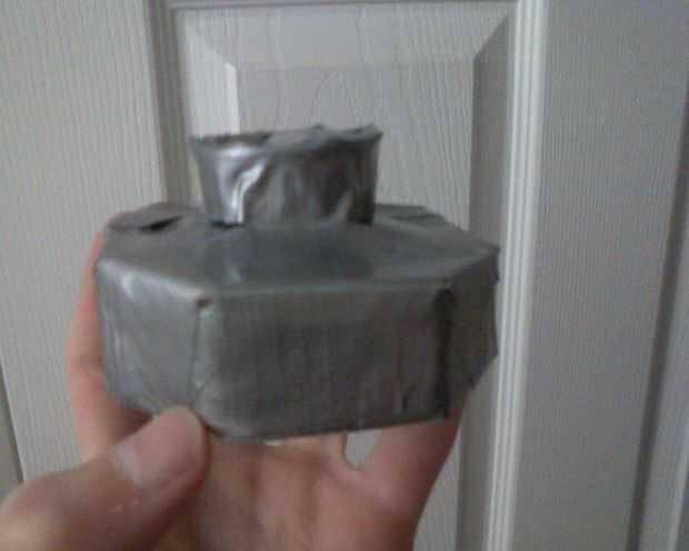 bien, por lo que deben tener conducto de cinta todo por ahora, zapatos de la cinta del conducto, calcetines, guantes, bolsos del ordenador portátil, chaquetas, todo. Pero una cosa no tiene, es una máscara de la cinta de conducto. La última parte de l