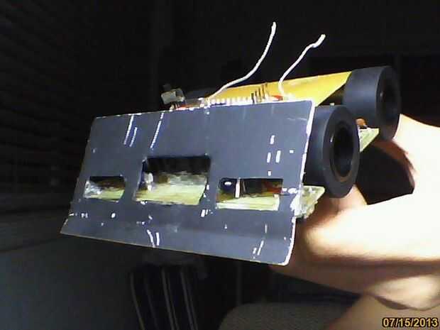 Para los ojos, utiliza un Sensor de proximidad Sharp para detectar enemigos de lejos y utiliza dos sensores de DIY IR de corto alcance para navegar por el enemigo. El bot también está equipado con dos sensores de piso para alojarte en el anillo.
