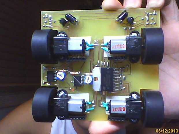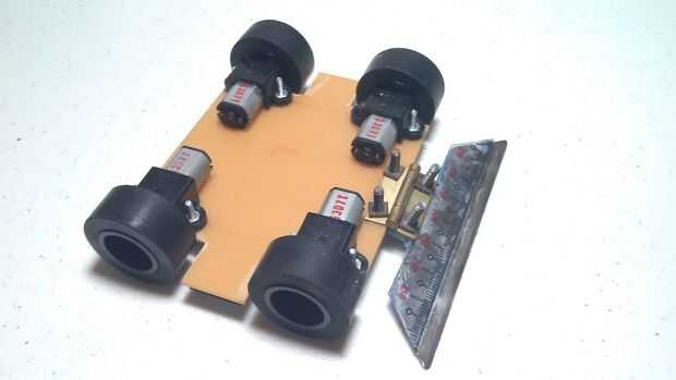 El chasis está hecho de fibra de vidrio (PCB). Diseño el diseño de PCB utilizando el software de diseño de diseño de fritzing . Para ahorrar espacio montara los motores directamente a mi PCB, por lo que el PCB actuaría como mi chasis. La cáscara se hace temporalmente cartón forma.