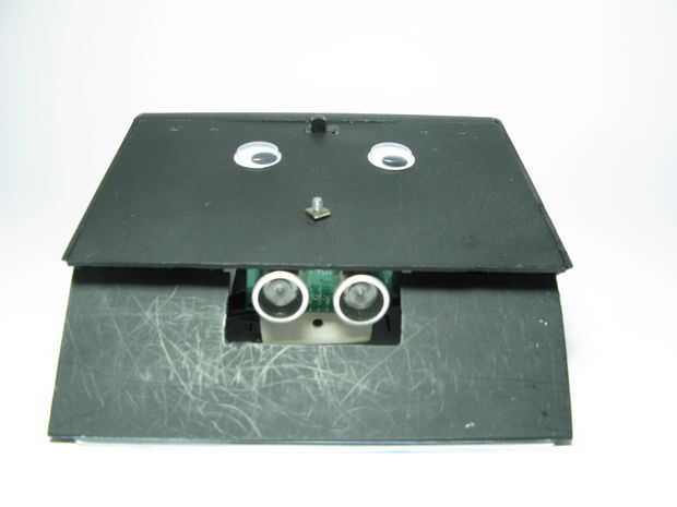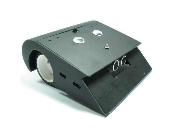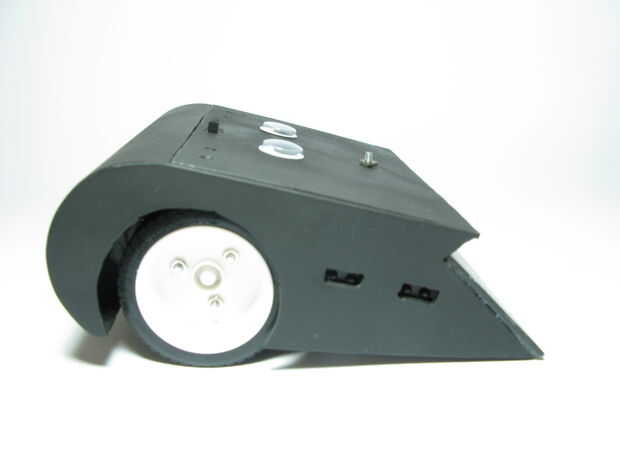 El bot contiene 9 sensores en total. Hay 3 sensores de piso, 2 sensores de lado, 3 sensores delanteros y 1 sensor trasero. Es accionado por un 7.5v 950mAh batería de LiPo recargable y tiene una duración de 1 hora (batalla continua). El cuerpo es todo de acrílico, corte con una herramienta giratoria. Pesa 450g y tiene una fuerza de empuje de 1,9 kg. No es que rápido pero sin duda tiene mucho de empujar energía "torquey".