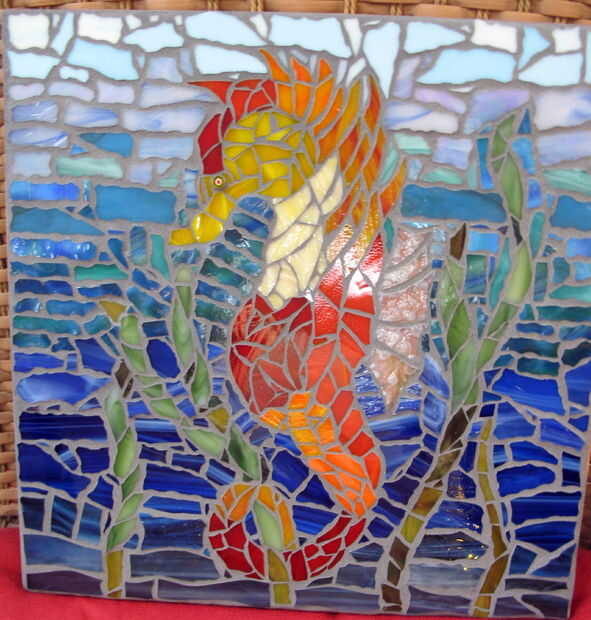 Tomé una clase de mosaicos el verano pasado y había hecho este mosaico de Caballito de mar. Tomé la clase para aprender sobre la fabricación de mosaicos - nunca había hecho esto antes y realmente no sabía qué hacer o cómo empezar. Mosaicos se pueden hacer con cualquier cosa y se utilizan sobre todo los azulejos, pero éste se hizo con el vidrio.