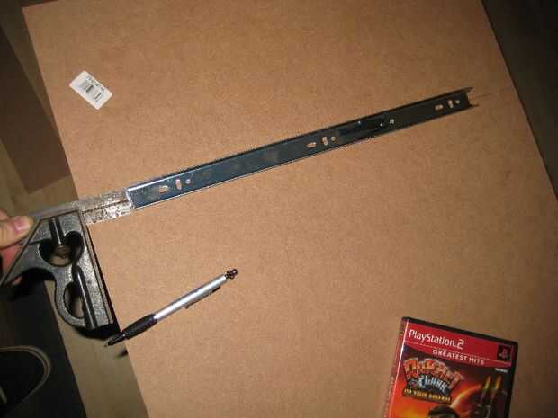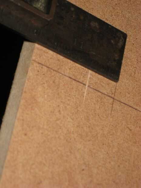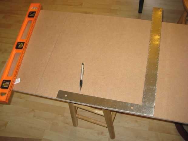Tomar el MDF hacia fuera, tapa la parte inferior.  Encontrar el centro y luego marque 10" desde el centro.  Entonces sería averiguar mi espacio para que cuando la bandeja MDF se deslice completamente. 5" a las puertas de armarios cerrados.  Otra vez la plazoleta mecer la escena.